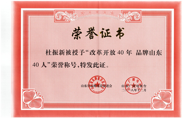 公司董事長杜振新榮獲“改革開放40年 品牌山東40人”